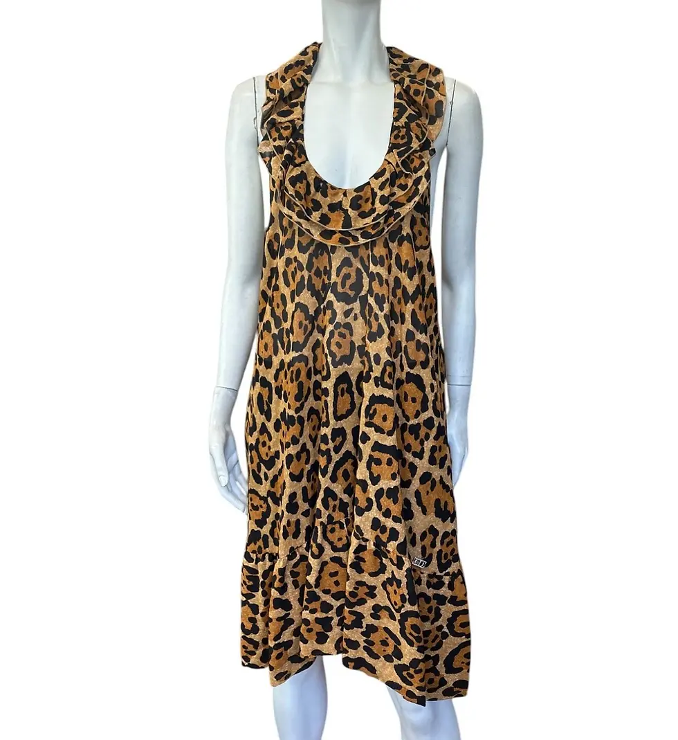 CHRISTIAN DIOR Silk Leopard Print Halter Neck Dress 8 Brown Black Ruffle