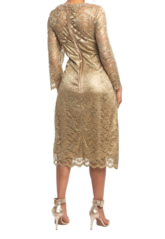 TERI JON Metallic Gold Floral Lace Sheath Dress 3/4 Sleeve Beaded Neckline 12 42