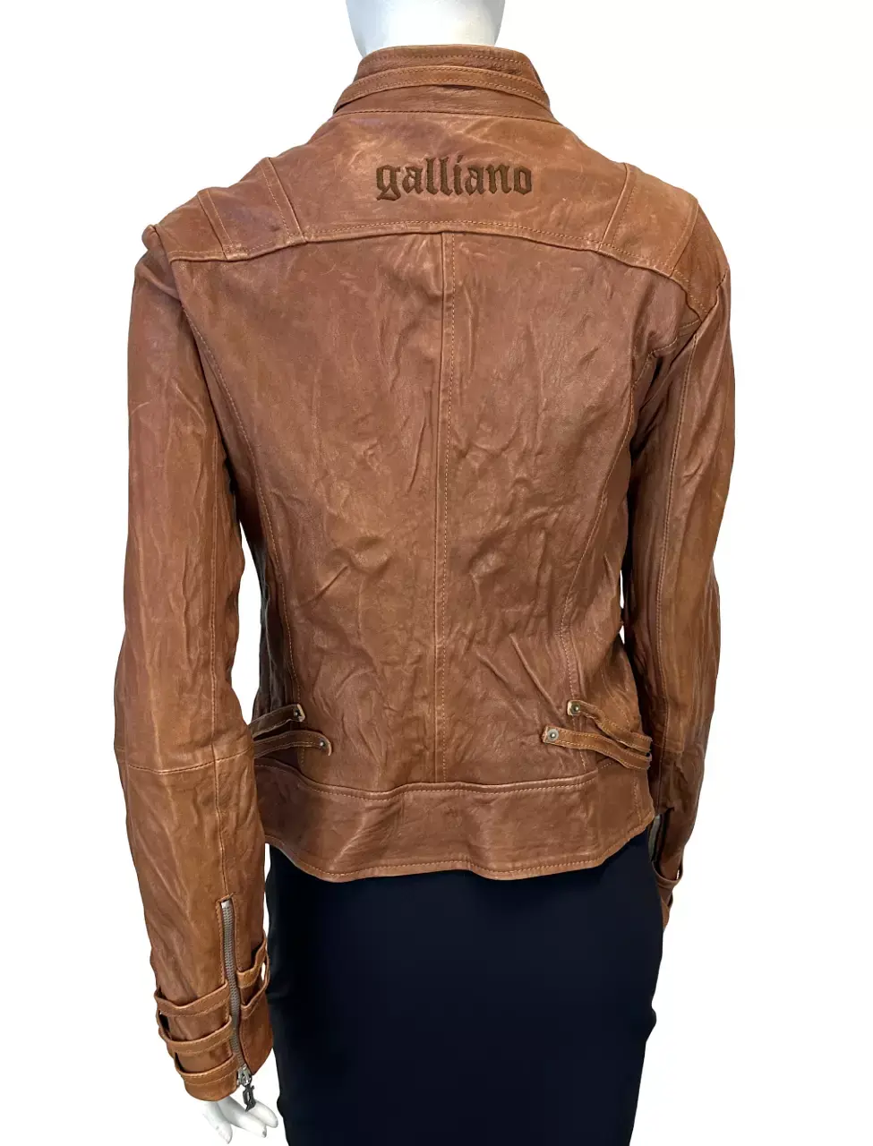 JOHN GALLIANO Leather Biker Jacket 44 Brown Straps Pockets Logo Small