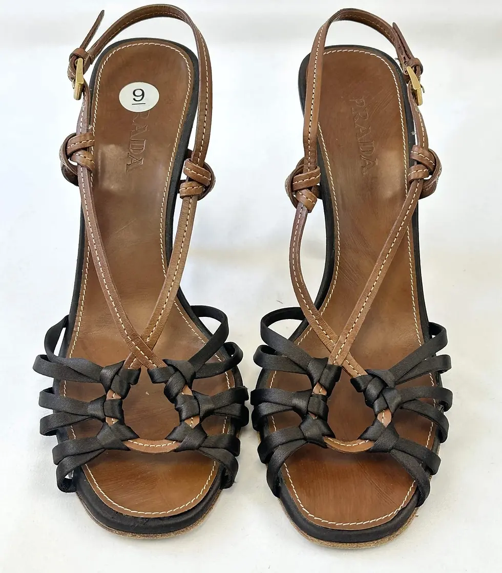 Vintage PRADA Satin Leather Sling Back Woven Heel Sandals 39 Brown Open Toe 9